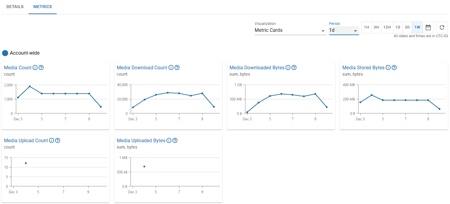 Exemplo: De acordo com esta métrica, o tamanho atingiu um pico de quase 400 MB. No entanto, após remover alguns arquivos de mídia, estabilizou-se em torno de 200 MB e diminuiu ainda mais após outra limpeza da biblioteca de mídia. Como a plataforma cobra por byte armazenado na biblioteca, pode ser benéfico realizar limpezas de tempos em tempos, bem como verificar se alguma otimização é possível para o tamanho de suas mídias.