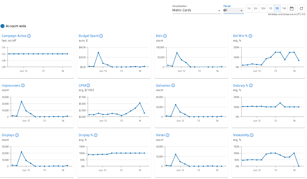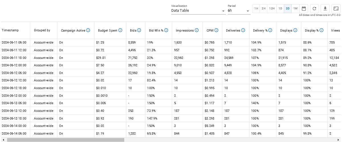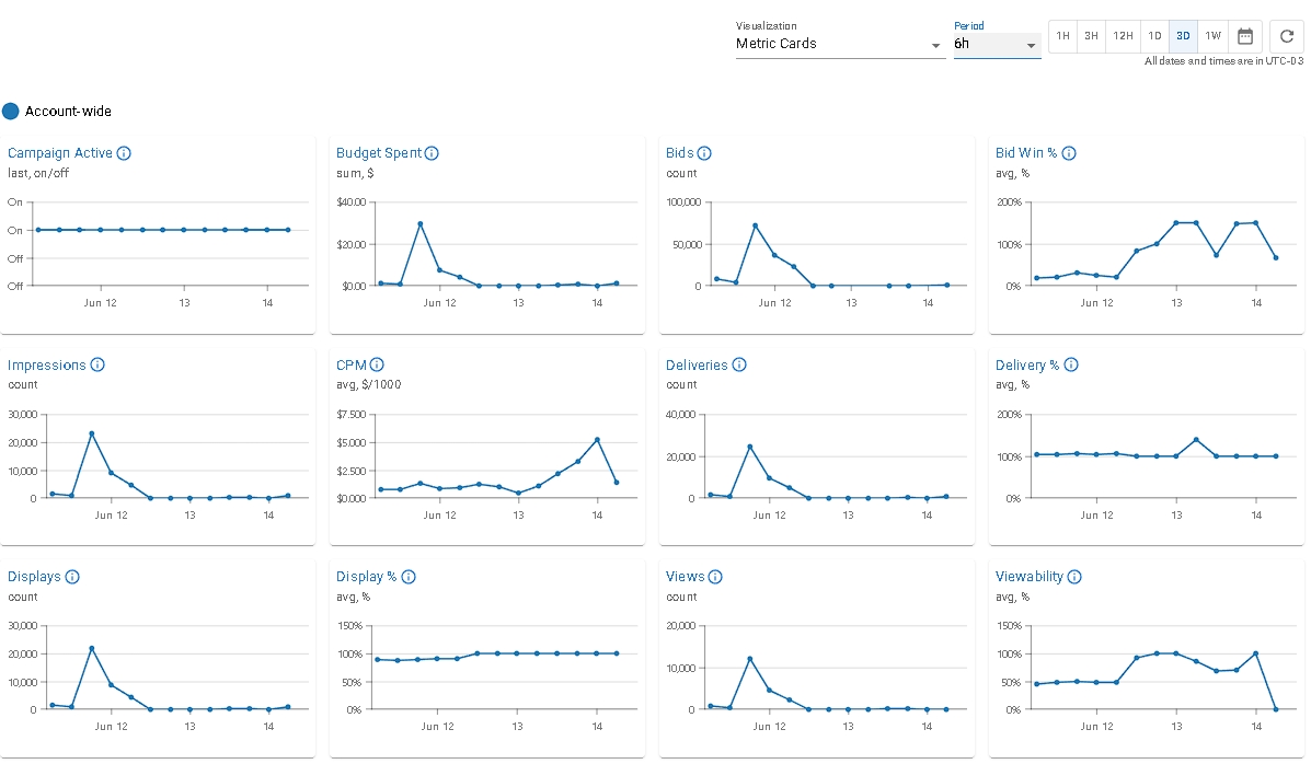 Algumas métricas, como o Preço do Lance Efetivo, também terão a opção de estatística em seus cartões. Esta opção permite visualizar seus dados de outra perspectiva. Usando o mesmo exemplo, para esta métrica podemos ver o preço do lance efetivo médio, mínimo e máximo.