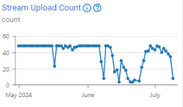 Exemplo: Neste gráfico, é possível ver que em algumas datas a contagem chegou a quase zero por não haver pipelines de eventos ativos ou por causa de uma limpeza. É importante verificar sua contagem de uploads, pois ela pode impactar como você está organizando seus fluxos de eventos. Ter muitos fluxos de eventos para organizar pode ser confuso, então uma limpeza ou otimização deve ser feita de tempos em tempos.