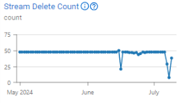 Exemplo: Ao começar a coletar dados para seu armazenamento de eventos, você definirá uma data de retenção para os dados. Toda vez que os dados atingirem essa data, seu fluxo de eventos será excluído, ou você também pode excluí-lo manualmente. Neste gráfico, você pode ver que, em algum momento, quase todos os fluxos de eventos foram excluídos.