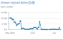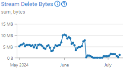 Exemplo: Cada fluxo de eventos é carregado para o seu armazenamento de eventos selecionado após alguns minutos, ficando disponível para download como um arquivo .JSON. A métrica apresentará a soma de todos os bytes dos fluxos de eventos carregados para o seu armazenamento de eventos. Neste gráfico, podemos ver que em datas específicas, os dados foram significativamente reduzidos devido à data de expiração de cada fluxo de eventos ou exclusão.
