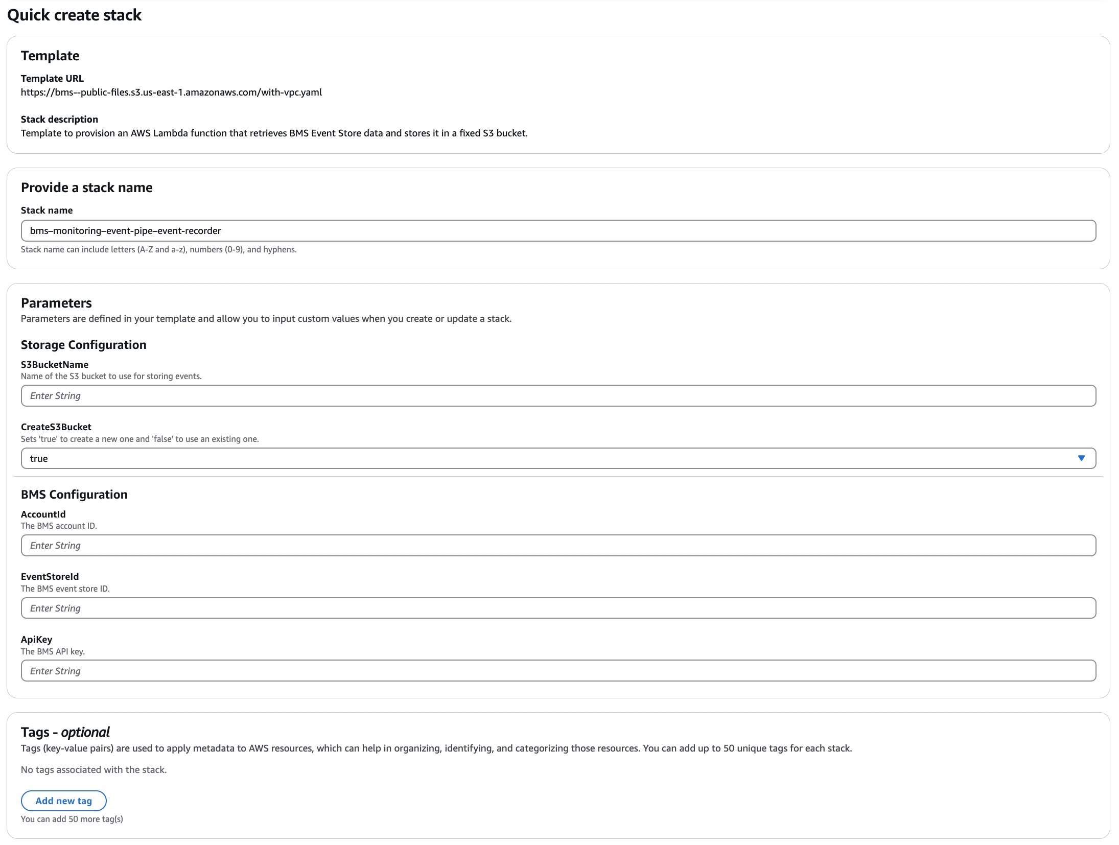Agora você integrou seus Armazenamentos de Eventos BMS com a AWS e seus dados começarão a ser enviados assim que a criação da stack for concluída. Você pode acompanhar esse processo no painel das suas stacks. Confira estes artigos para saber mais sobre recursos relacionados da BMS e produtos AWS: