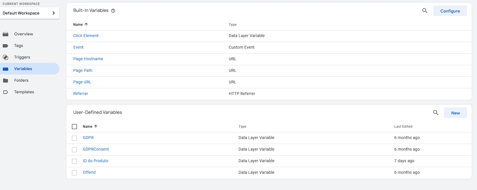Variáveis Constantes: Armazenam valores fixos (por exemplo, um ID de rastreamento estático usado em várias tags).
