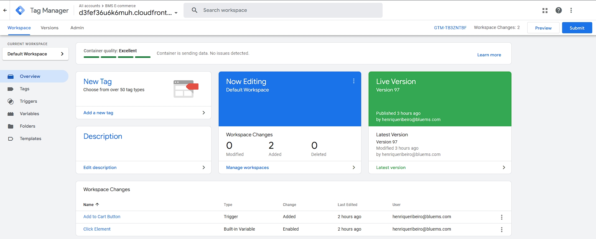 Após criar uma conta no GTM, você deve instalar o código do GTM nas páginas do seu site. Esse código pode ser encontrado na página inicial do seu contêiner.