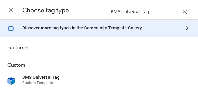 Ao criar uma nova tag, você precisará escolher o tipo da sua tag; é aqui que você encontrará nosso modelo após pesquisá-lo como "BMS Universal Tag".