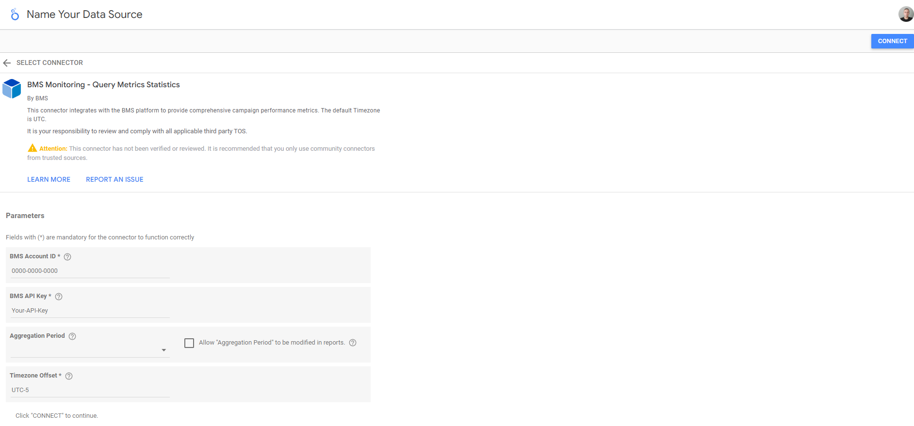 Parâmetros do Conector BMS ID da Conta BMS: Insira o ID da conta BMS que será conectada ao Looker Studio, no formato XXXX-XXXX-XXXX.