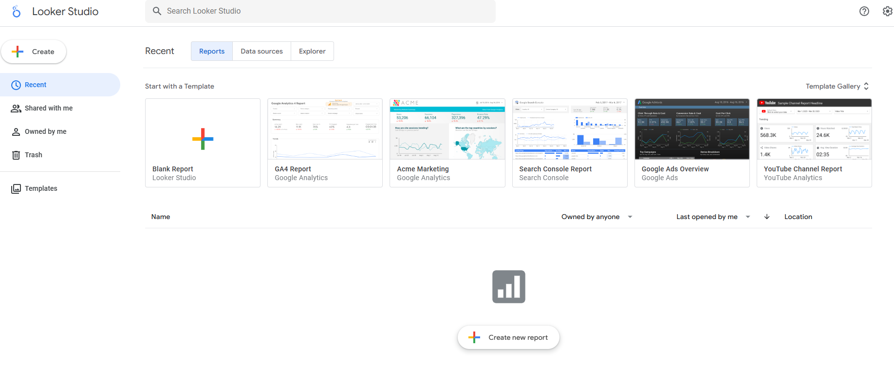 Acesse o Looker Studio. Pode ser necessário criar uma conta caso você ainda não tenha uma.