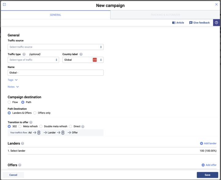 Editor de Campanha no Voluum - Aba Geral Preencha os detalhes: