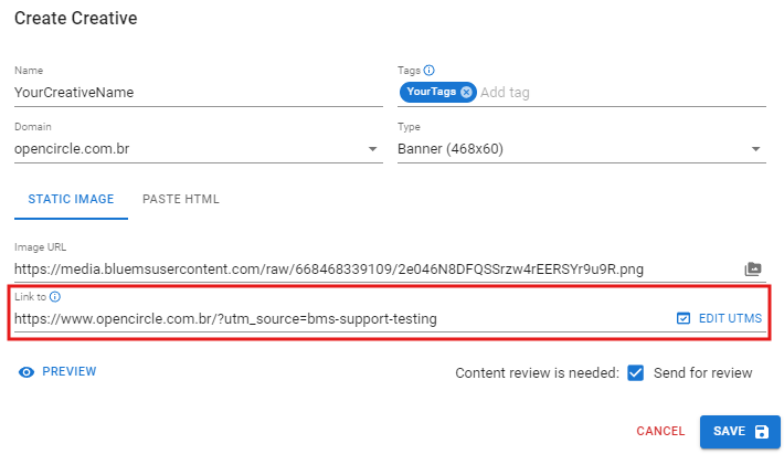 Editor de Criativos – Link para URL de Clique de Impressão: Este parâmetro permitirá que o Voluum rastreie impressões nas suas campanhas BMS. Você deve copiá-lo usando o botão de copiar, colar essa URL dentro de uma tag de pixel como fonte e, em seguida, adicionar essa tag de pixel ao código HTML do seu criativo.