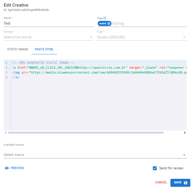 Editor de Criativos - Aba de Colar HTML